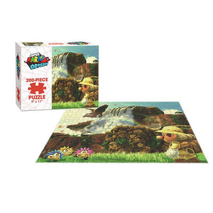 Venture through the Jurassic topography of Cascade Kingdom! In this scenic 200-piece puzzle, Mario and Cappy are on a mission to trek to the top of the ancient Triceratops to battle Madame Broode with the hopes of rescuing Princess Peach and Tiara! 200 Pieces | 9" x 11" Finished Size